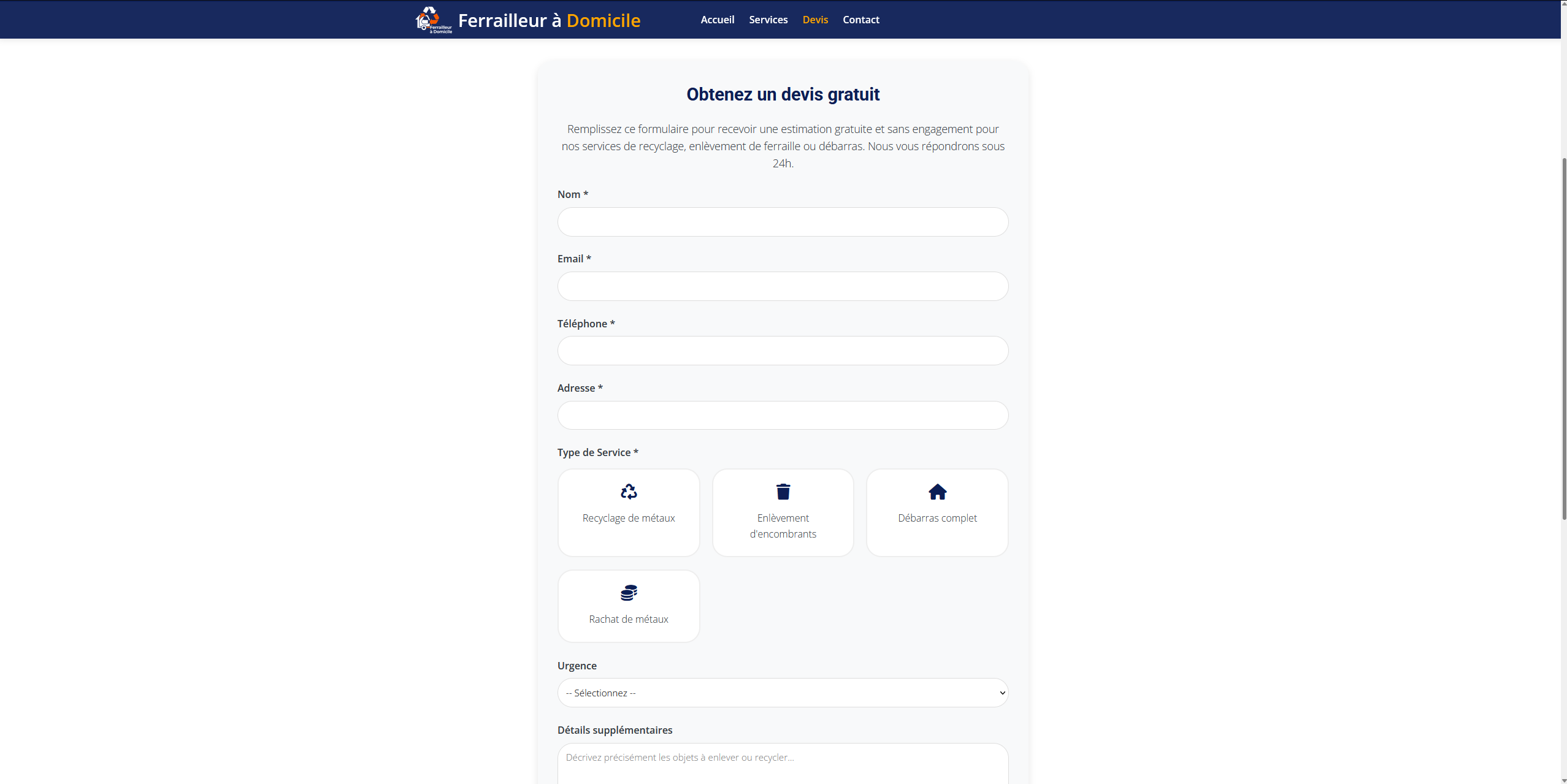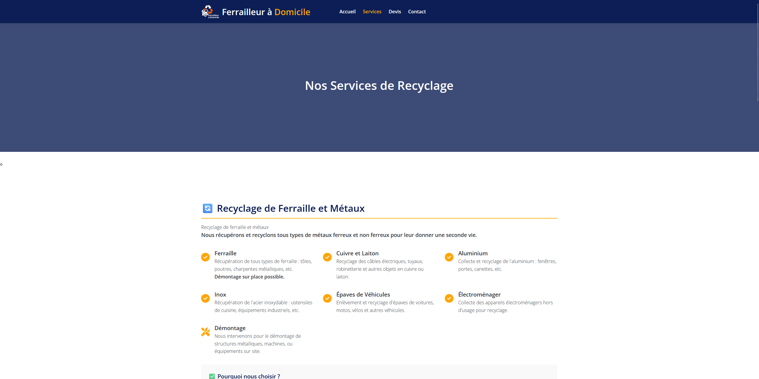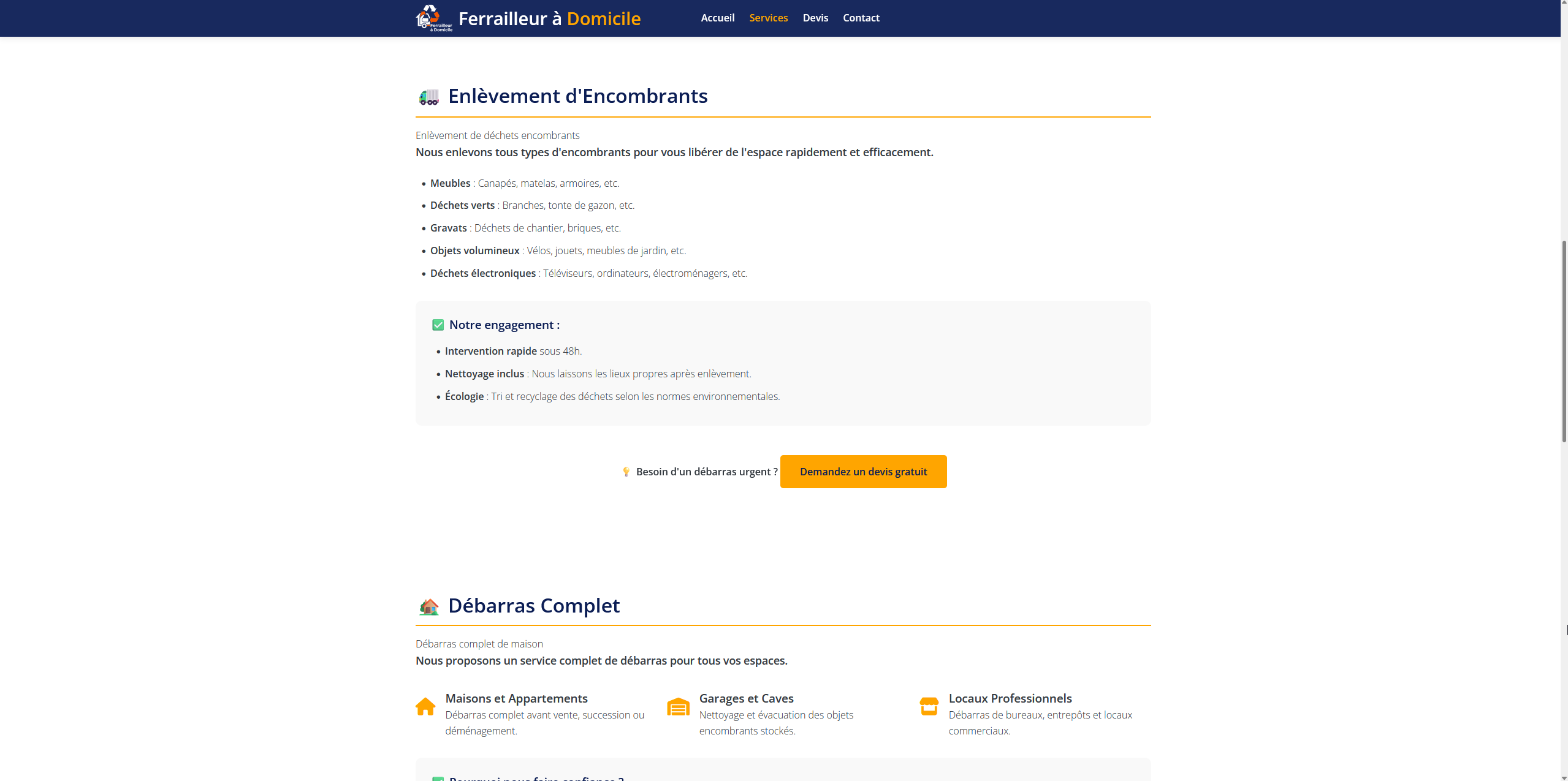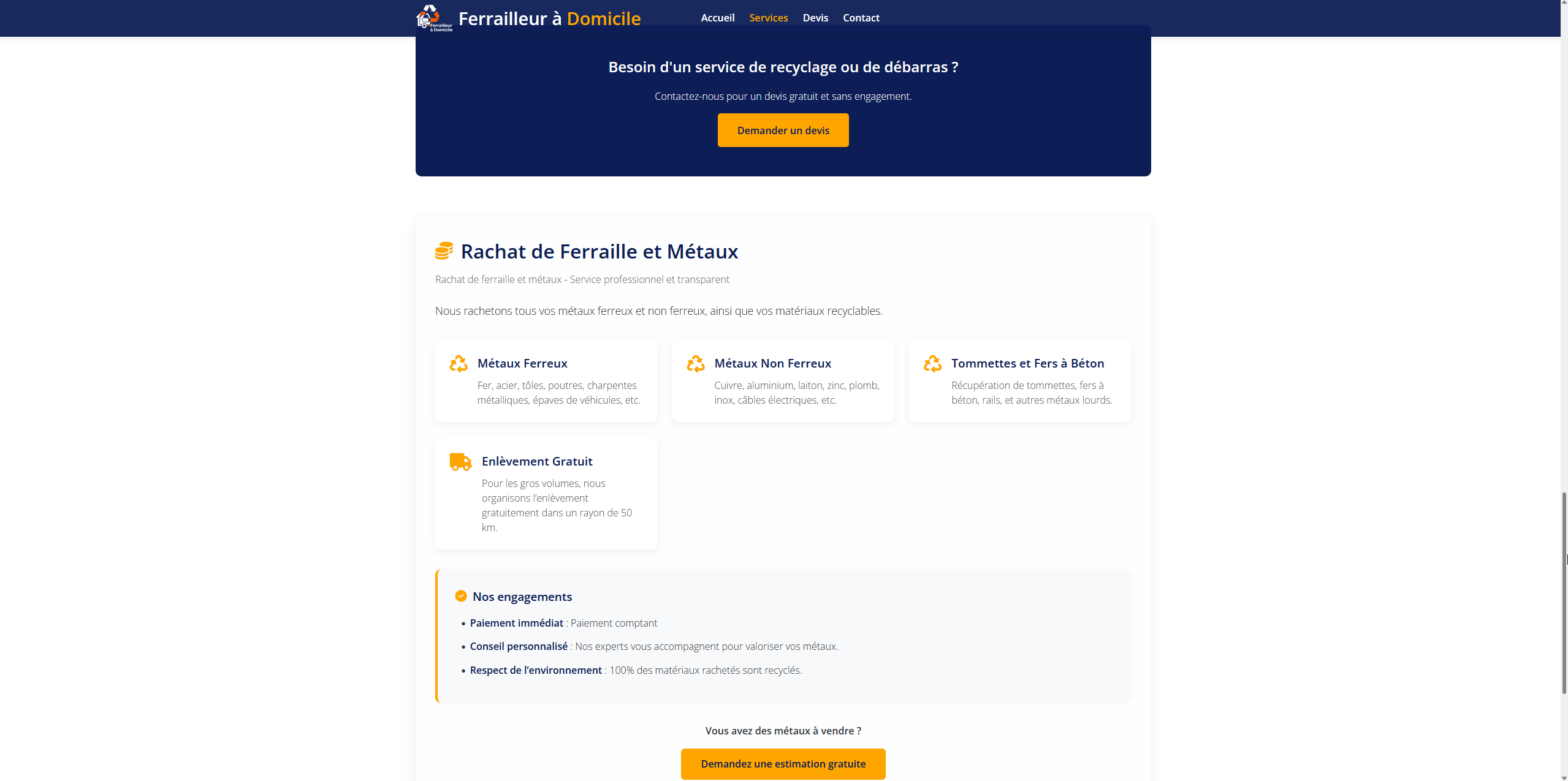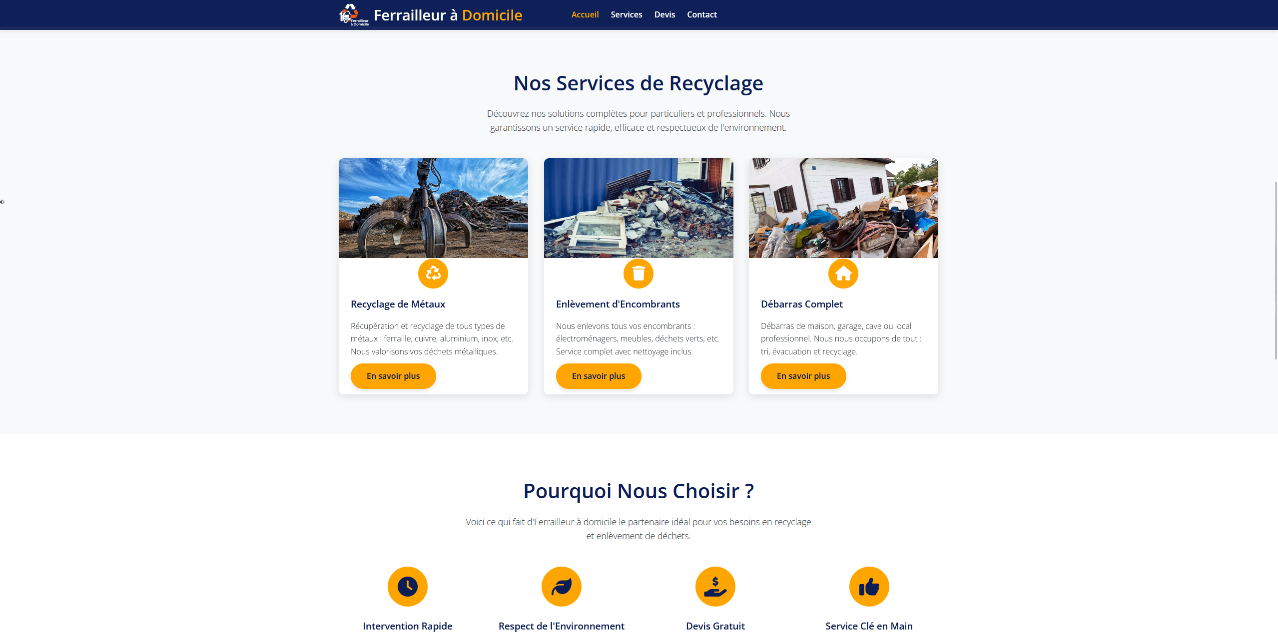 Ferrailleur à Domicile 72 propose un service rapide et pratique d’enlèvement, de recyclage et de rachat de ferraille et d’encombrants dans la Sarthe. Le site met en avant un service clé en main, respectueux de l’environnement, avec devis gratuit et intervention rapide.